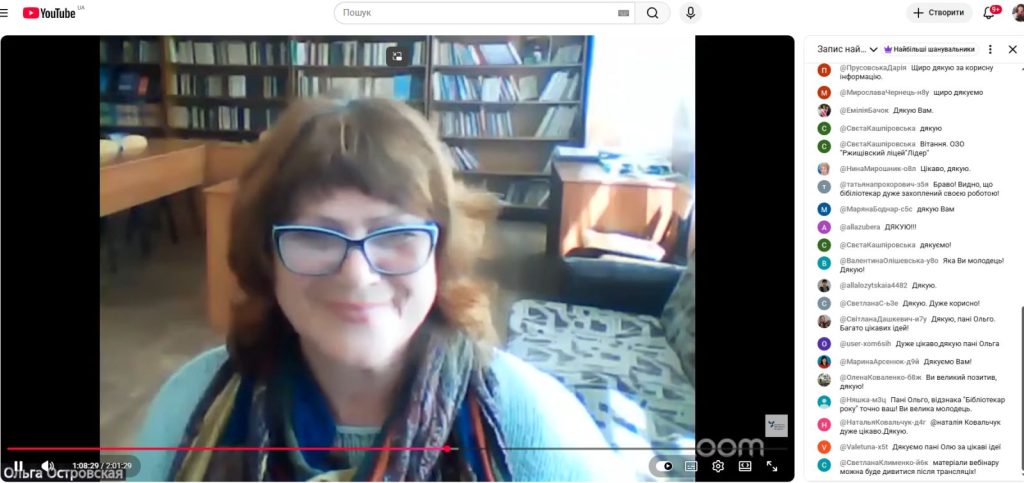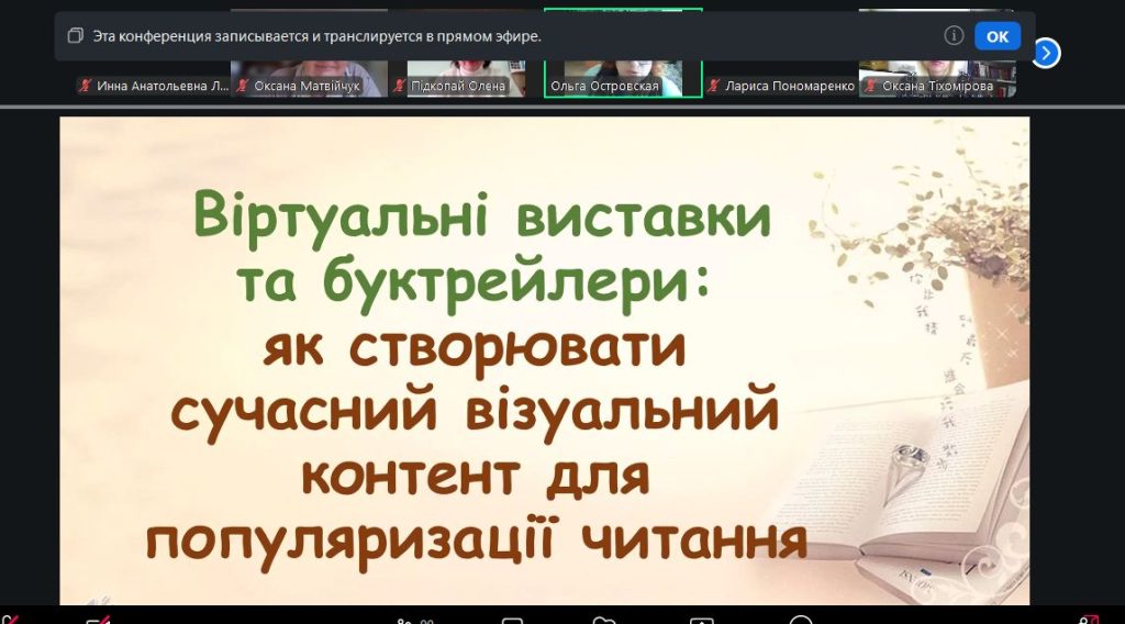 На вебінарі бібліотекар гімназії Ольга Пилипівна Островська презентувала свої роботи з теми «Віртуальні виставки та буктрейлери: як створювати сучасний візуальний контент для популяризації читання».